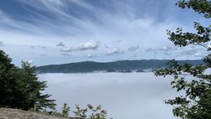 前日まで雨で、一気に天気が変わった時、こんな現象が起きるそうです。狙っていくと中々見れない雲海。富士山の頂上から見て以来!!すごく幻想的。時間が経つにつれて、風下の方から雲が取れ、湖が姿を現してきました。